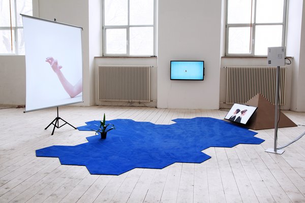 The installation combines various reflections on nonverbal communication on a honeycomb carpet.