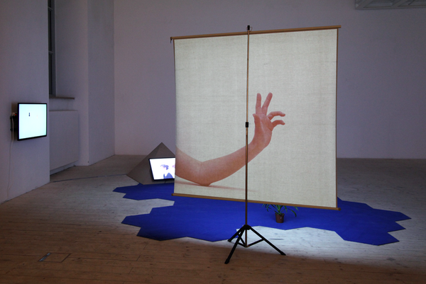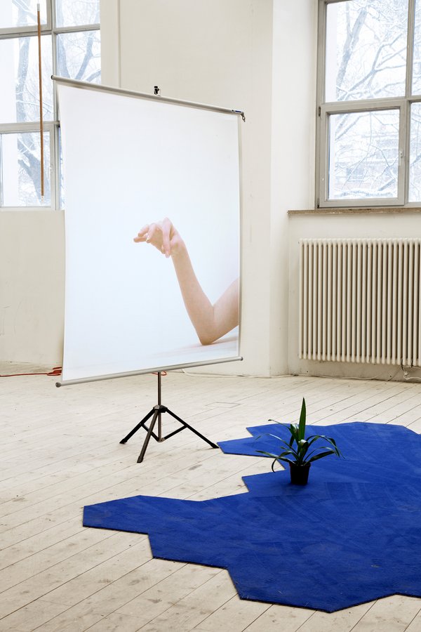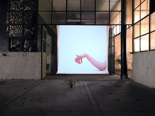 The installation "Asking a Plant to Teach Movement" shows a yucca palm on the floor. Behind the plant is a screen on which a projected hand imitates the postures of the plant in slow, successive choreographed positions. The hand tries to do what the plant does, to posture or gesture as the plant moves, trying to learn what the plant knows.